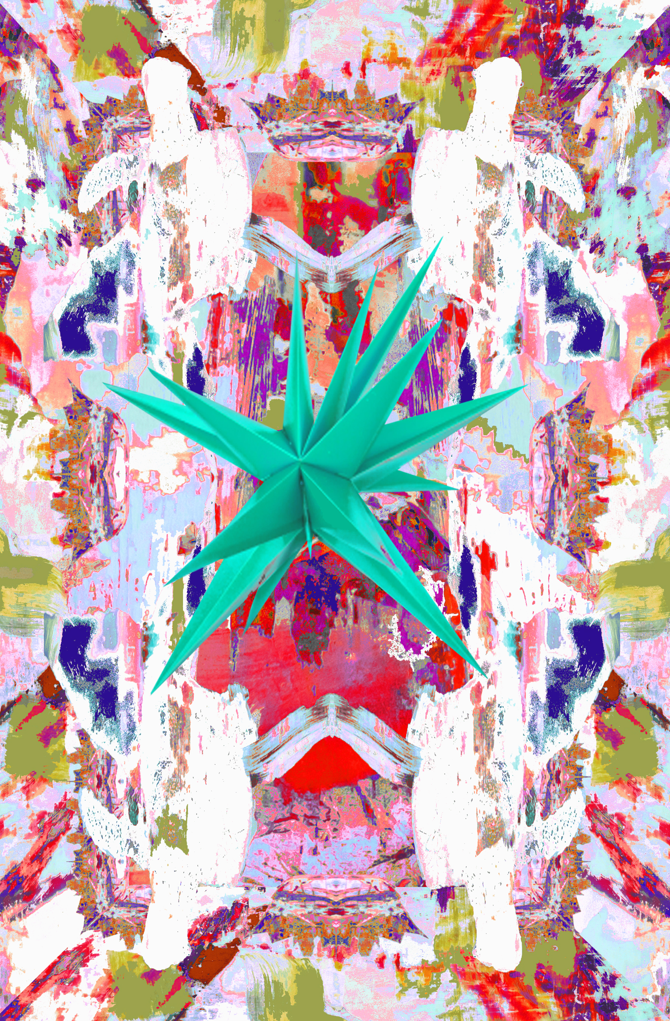 Die Grundlage der Karte ist ein Digitaldruck ihrer digitalen Collage FLYING CARPET B02_4/10_2021 (peace-circle). Für diese Arbeit fotografierte die Künstlerin mehrere ihrer Gemälde, entnahm den Fotos Macro-Details der Bilder und fügte sie am Computer zu digitalen Collagen zusammen.