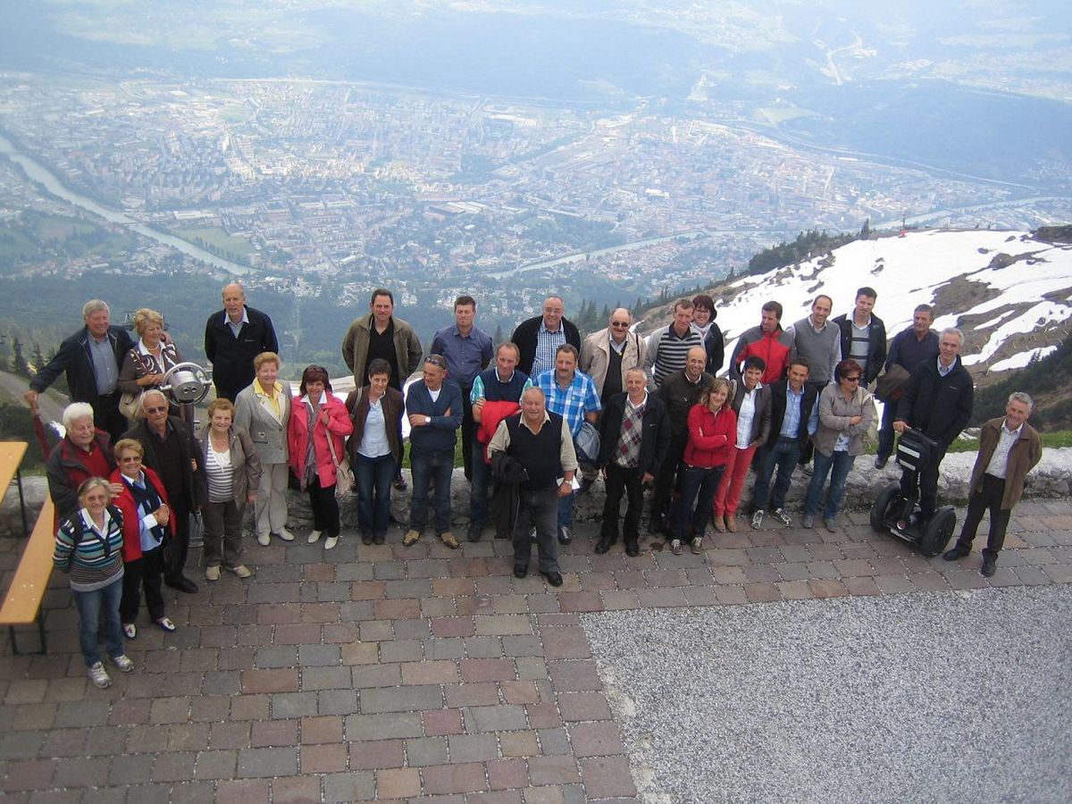 Nach der Besichtigung ging es weiter zum nächsten Ziel, zur Talstation der neuen Hungerburgbahn, von wo aus die Ausflügler in 20 Minuten mit der neuen Bahn auf die Hungerburg und dann mit der Seilbahn auf die Seegrube befördert wurden, wo im Panoramarestaurant das gute Mittagessen eingenommen wurde. Dabei konnte ein wunderbarer Blick auf Innsbruck und die umliegenden Berge genossen werden, Sogar Schneehalden waren noch auf der Seegrube, einem wichtigen Wintersport- gebiet, zu sehen, aber es konnte eine wunderbare Ruhe genossen werden, da außer Saison. Nach zwei schönen Stunden auf 2400m Meereshöhe fuhren die Schenner wieder mit der Seilbahn und der Hungerburgbahn ins Zentrum von Innsbruck zurück.