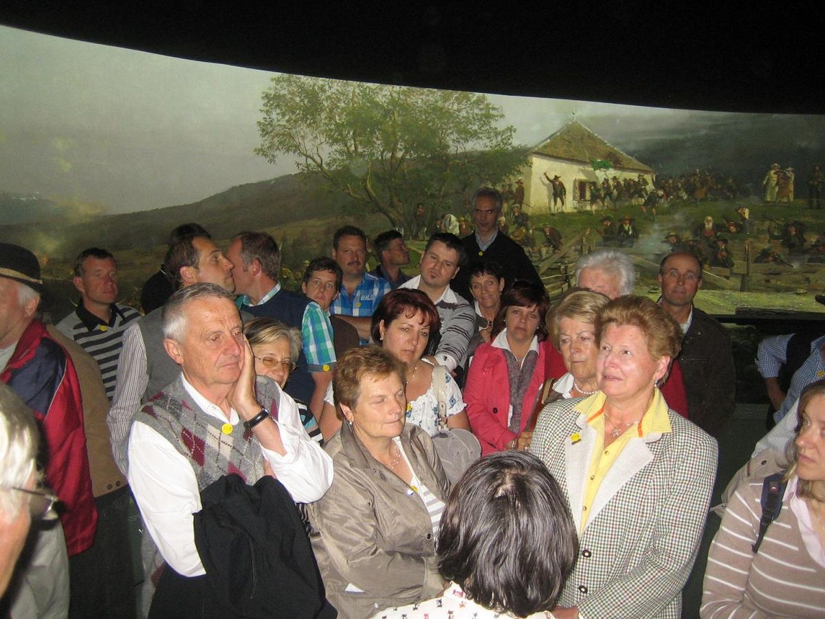 Wie schon seit vielen Jahren wurde auch heuer bei der Generalversammlung der Raiffeisenkasse Schenna unter den anwesenden Mitgliedern ein Mitglieder-Ausflug verlost. Die 15 Losgewinner durften jeweils eine Begleitung nach Wahl mitnehmen; auch die Schenner Böhmische wurde als Dank für die musikalische Umrahmung der Vollversammlung zur Fahrt eingeladen. Außer dem Obmann Stefan Klotzner waren auch Direktor Klaus Gufler und Vizedirektor Hermann Orian mit dabei; sie leiteten den Ausflug und gestalteten das reichhaltige Programm. Am Mittwoch, den 24. Mai um 8 Uhr starteten die 35 Teilnehmer aus Schenna, Verdins und Tall und kamen, nach einem kurzen Stopp in Freienfeld, um 10 Uhr am Bergisel zur Besichtigung des Rundgemäldes an. Eine redegewandte und geschichts- bewanderte Führerin erwartete sie und gab anhand der in der Vorhalle aufgestellten Holzfiguren von Andreas Hofer, Josef Speckbacher, Erzherzog Johann u.a. einen guten Überblick über das Jahr 1809 und die Schlacht am Bergisel. Dann wurde das Rundgemälde selbst besichtigt. Besonders beeindruckend war das riesige Rundgemälde vor allem für jene, die es zum erstenmal gesehen haben. Aber auch wer es sogar schon an seinem alten Platz in Innsbruck gesehen hat, fand es an seinem neuen Platz im eigens erbauten Bergisel-Museum viel eindrucksvoller in seiner Weite und in der guten Beleuchtung.