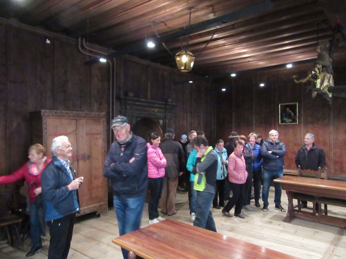 Weiter ging es zur Besichtigung der am südlichen Stadtrand gelegenen Pfarrkirche „Maria Moos“ welche zu Beginn des 15. Jahrhunderts durch edle und wohlhabende Sterzinger Familien finanziert wurde. So langsam machte der Hunger auf sich aufmerksam, sodass wir mit dem Bus das über die Landesgrenzen hinaus bekannte historische Wirtshaus am Berg „Pretzhof“ in Pfitsch aufsuchten. Dort erwartete uns ein zünftiges Mittagessen zusammengestellt aus hofeigenen Gerichten und eigener Tierhaltung. Noch ausreichend Zeit für ein kurzes Watterle, dann ging es weiter nach Ratschings/Mareit zur Besichtigung des Landes-Jagd- und Fischereimuseum „Schloss Wolfsthurn“. Beeindruckt von den vielen Ausstellungsexemplaren der Tierwelt und den altertümlichen Gewehr- und Schusswaffen, starteten wir den Bus gegen Abend wieder zur Rückfahrt in Richtung Schenna.