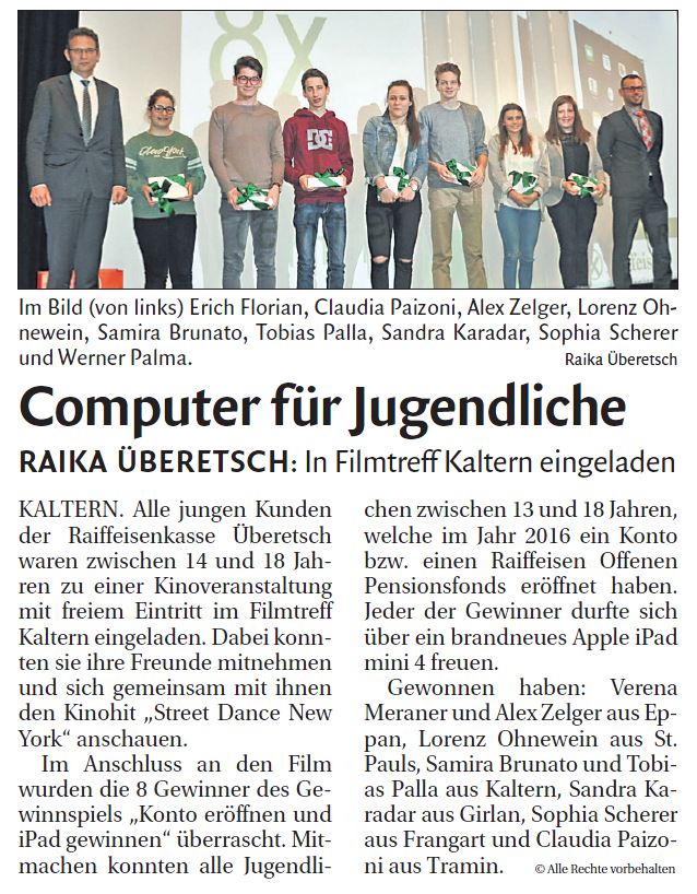 • Überetscher Gemeindeblatt - 05.01.2017 - "Raiffeisenkasse Überetsch hat Sponsorvertrag verlängert"