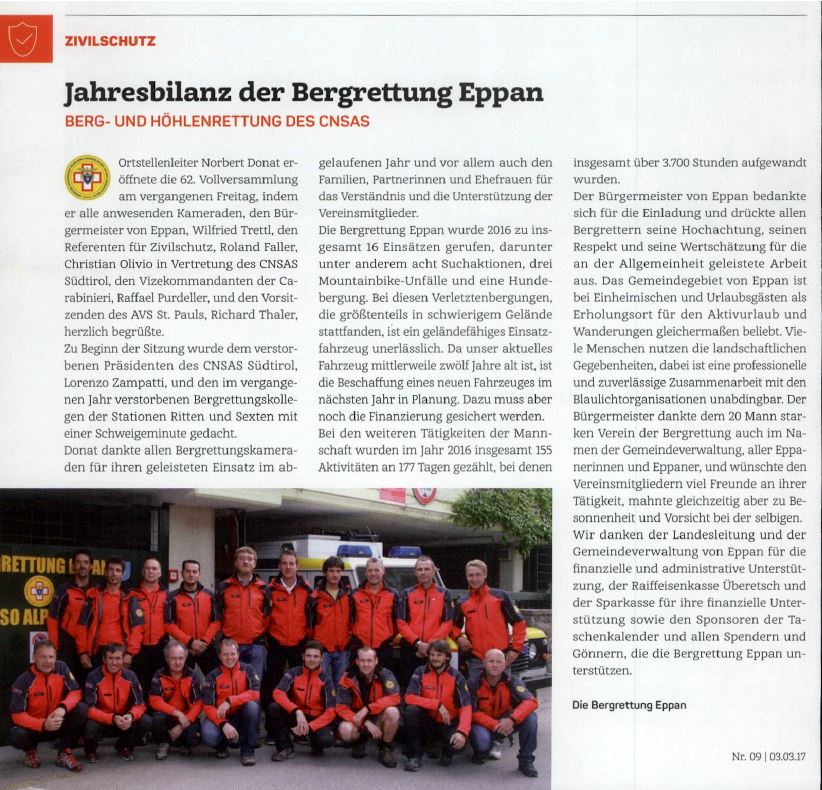 • Überetscher Gemeindeblatt - 03.03.2017 - "Jahresbilanz der Bergrettung Eppan"