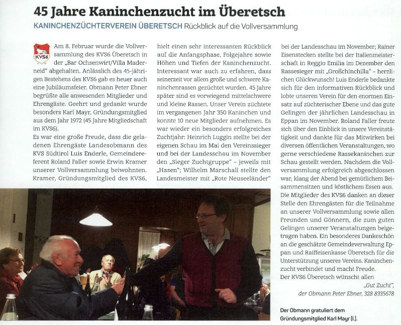 • Überetscher Gemeindeblatt - 24.02.2017 - "45 Jahre Kaninchenzucht im Überetsch"