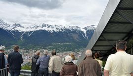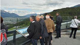 Beim anschließenden Mittagessen im Gasthof Purner bei Thaur tauschten sich die Mitglieder ausführlich über die gewonnenen Eindrücke aus und konnten sich so für das nächste anstehende Highlight stärken. Denn im Anschluss ging es zur Bergisel-Schanze nach Innsbruck, welche durch ihre moderne Architektur eine besondere Faszination ausübt. Geplant von Stararchitektin Zaha Hadid bietet die Aussichtsterrasse einen atemberaubenden Ausblick auf Innsbruck und bietet einen Eindruck der Tollkühnheit der Skispringer.