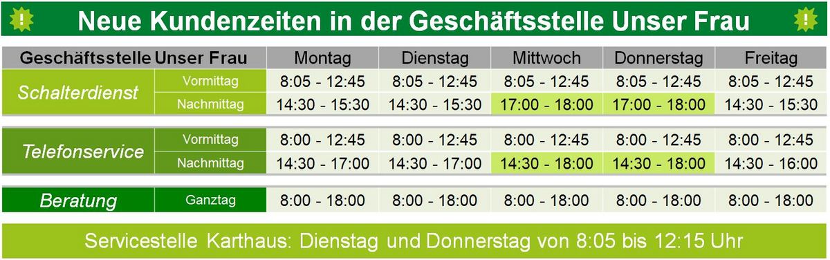 NEU: Wir haben die Vormittags-Öffnungszeiten erweitert und sind nun bis 12:45 Uhr für Schalterdienste geöffnet. Die Schnalser Kunden äußerten des Öfteren den Wunsch nach unterschiedlichen Schalteröffnungszeiten. Diesem Wunsch sind wir nachgekommen und haben nun zwei Abendöffnungszeiten eingeführt. Somit sind wir am Mittwoch und am Donnerstag in der Geschäftsstelle Unser Frau von 17:00 bis 18:00 Uhr für Schalterdienste geöffnet.