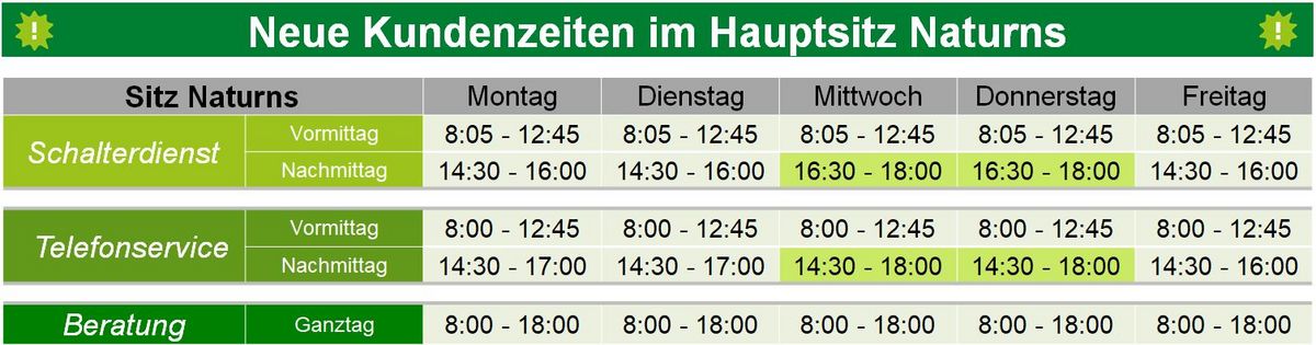 NEU: Die beliebte Mittwochabend-Öffnungszeit im Hauptsitz in Naturns wird erweitert, indem wir nun zusätzlich den langen Donnerstag einführen. Somit sind wir an zwei Tagen in der Woche von 16:30 bis 18:00 Uhr für Schalterdienste geöffnet.