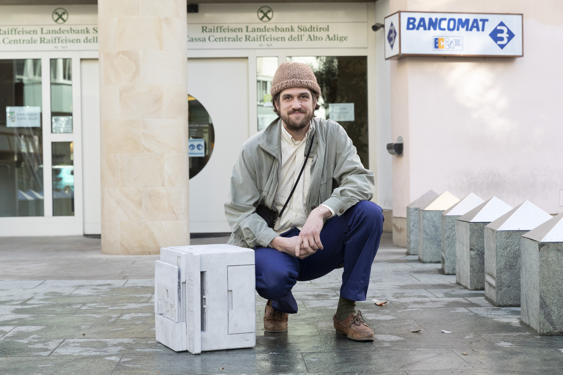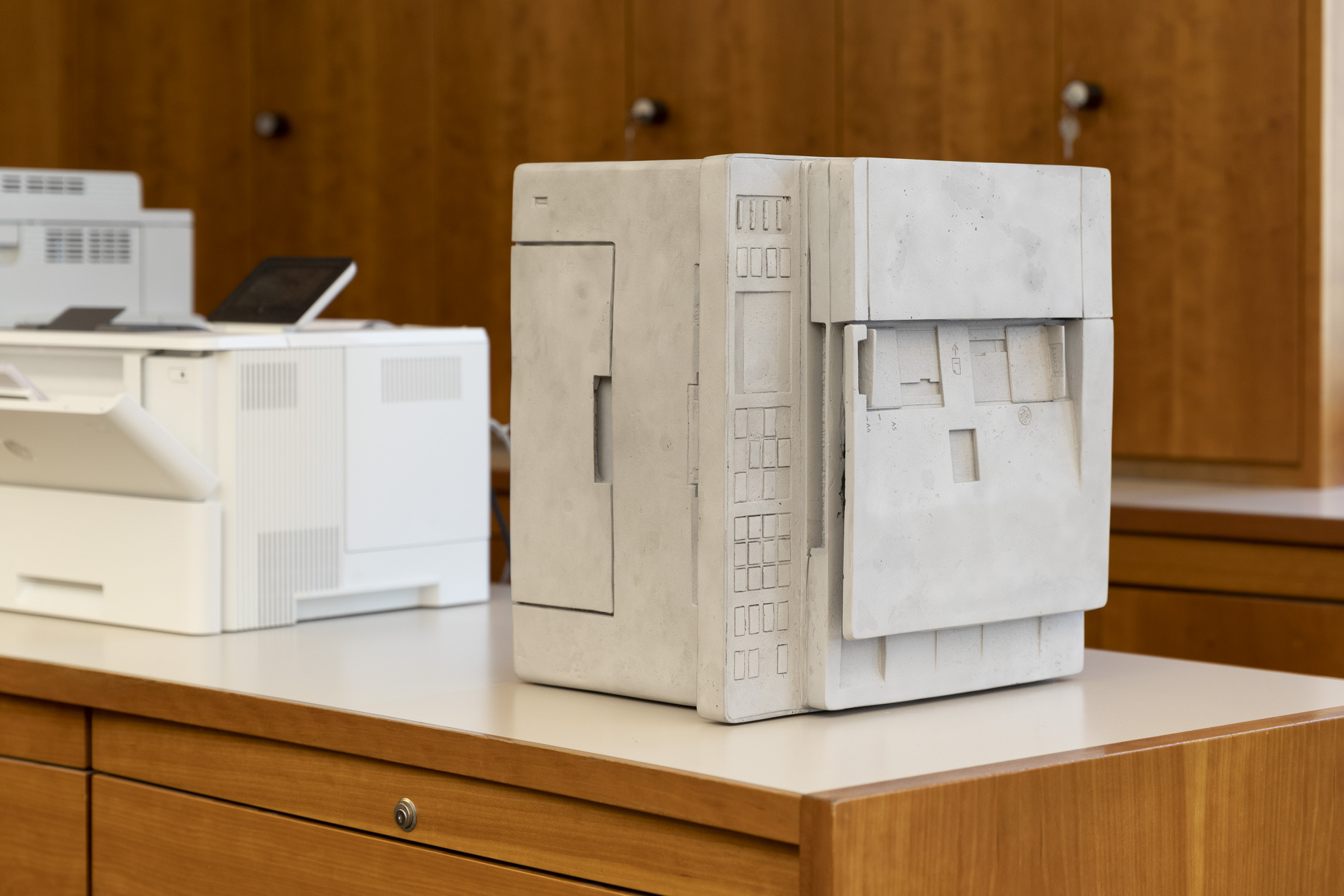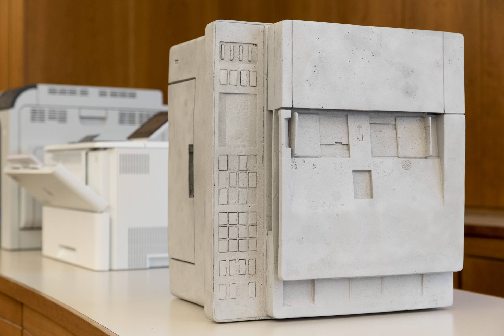 Alexander Wierer schuf die Skulptur „o.T. (Printer)“ für die Raiffeisen Landesbank Südtirol. „Wierers Arbeit ertappt uns in unserem geschäftigen Berufsalltag, in dem wir erwarten, dass alles einen Zweck hat und funktioniert. Nur wer genau hinschaut, erkennt das Kunstwerk“, sagt Präsident Hanspeter Felder.