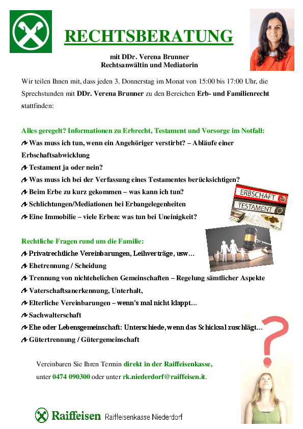 Wir teilen Ihnen mit, dass jeden 3. Donnerstag im Monat von 15:00 bis 17:00 Uhr, in der Raiffeisenkasse Niederdorf Sprechstunden mit DDr. Verena Brunner zu den Bereichen Erb- und Familienrecht stattfinden.
