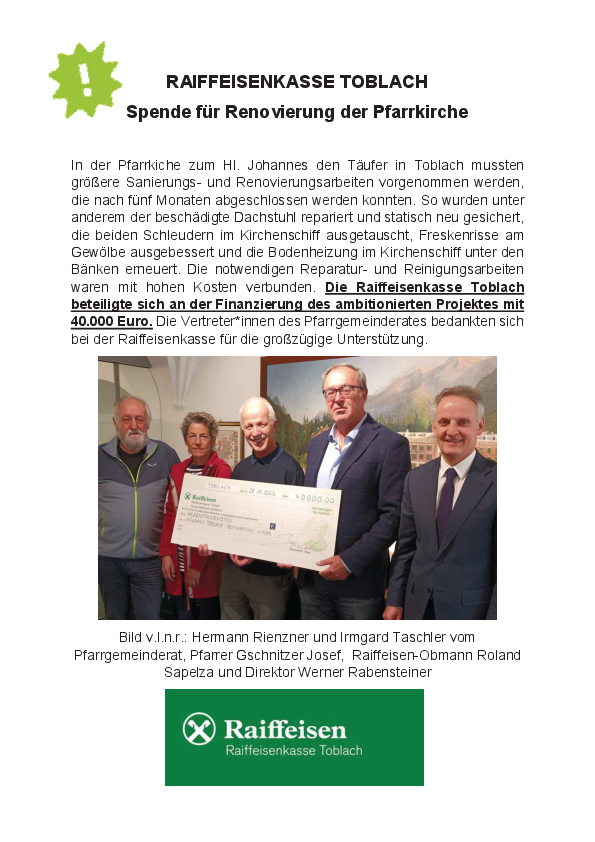 Spende für Renovierung der Pfarrkirche
