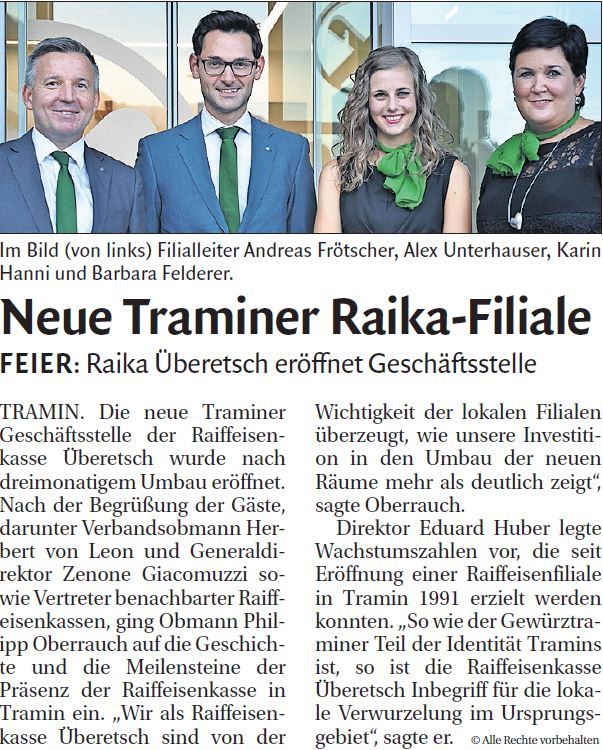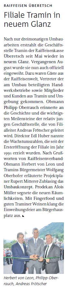 • Raiffeisen Magazin - 11.10.2016 - "Filiale Tramin erstrahlt in neuem Glanz"