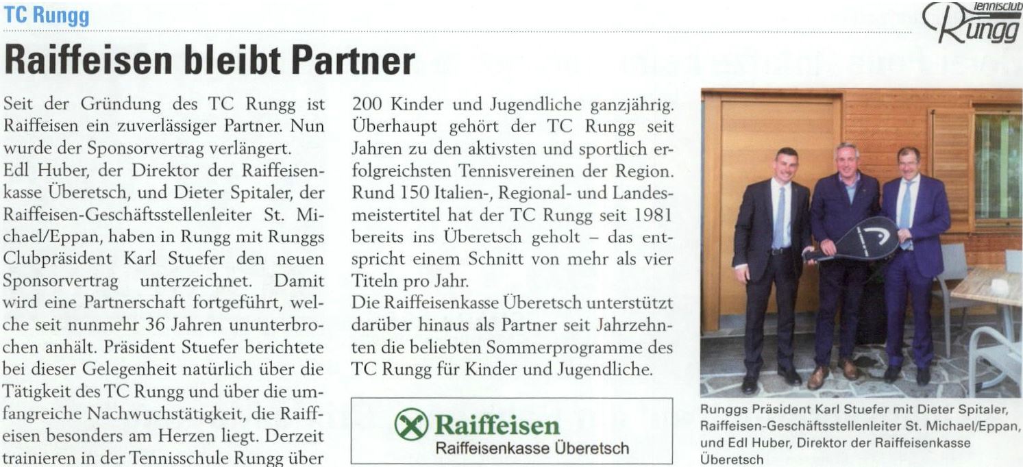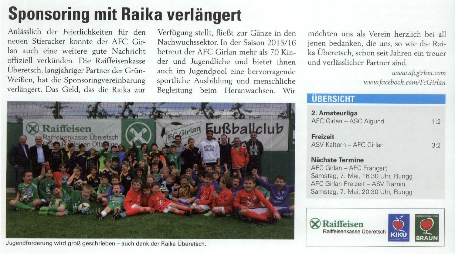 • Überetscher Gemeindeblatt - 15.04.2016 - "Verlängerung des Sponsorvertrages mit der Raika"