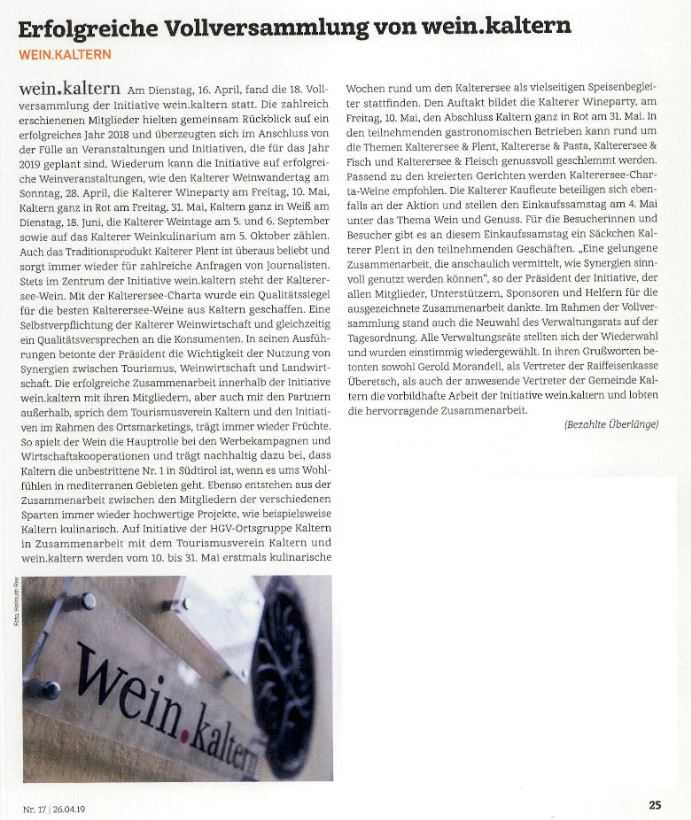 • Überetscher Gemeindeblatt - 24.04.2019 - "Erfolgreiche Vollversammlung von wein.kaltern"